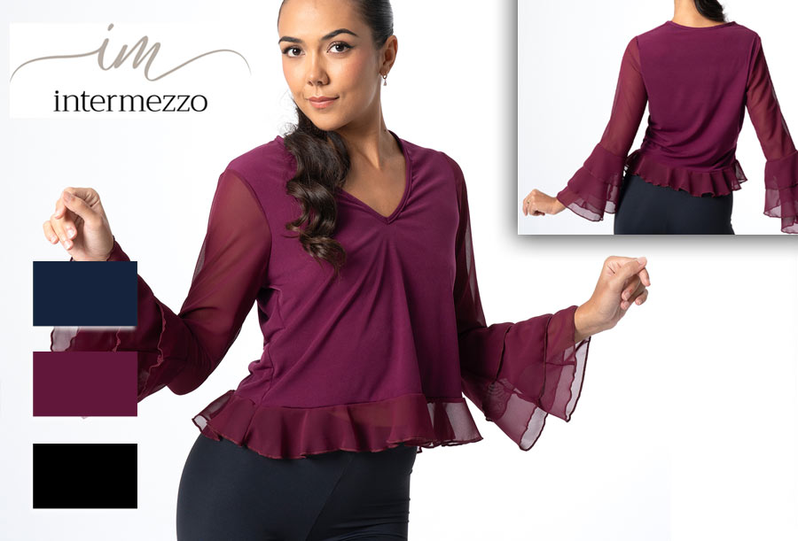 Bluse mit V-Ausschnitt. Lange Ärmel mit drei asymmetrischen Chiffonrüschen. Saum mit Chiffonrüsche.